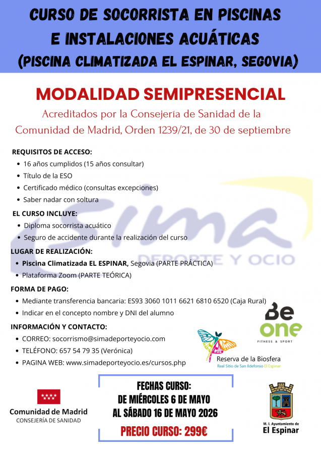 CURSO SOCORRISTA EL ESPINAR, SEGOVIA. DEL 6 AL 16 DE MAYO. Curso de socorrismo en piscinas e instalaciones acuáticas, acreditado y homologado por la Consejería de Sanidad de la Comunidad de Madrid, válidos para trabajar...